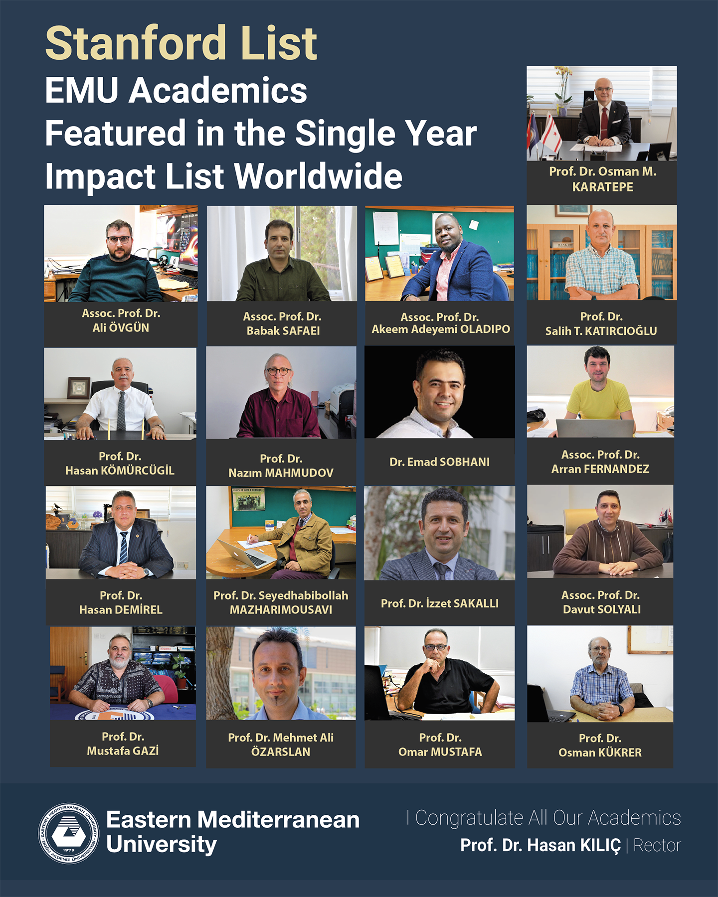 The scholars featured on the said list are; Prof. Dr. Osman M. Karatepe, Vice Rector for Academic Affairs and Faculty of Tourism Academic Staff Member; Assoc. Prof. Dr. Ali Övgün, Faculty of Arts and Sciences, Department of Physics Academic Staff Member; Assoc. Prof. Dr. Babak Safaei, Faculty of Engineering, Department of Mechanical Engineering Academic Staff Member; Assoc. Prof. Dr. Akeem Adeyemi Oladipo, Faculty of Arts and Sciences, Department of Chemistry Academic Staff Member; Prof. Dr. Salih T. Katırcıoğlu, Faculty of Business and Economics, Department of Banking and Finance Academic Staff Member; Prof. Dr. Hasan Kömürcügil, Faculty of Engineering, Department of Computer Engineering Academic Staff Member; Prof. Dr. Nazım Mahmudov, Faculty of Arts and Sciences, Department of Mathematics Academic Staff Member; Dr. Emad Sobhani, Former Researcher of Nanotechnology & Multifunctional Structures Research Center; Assoc. Prof. Dr. Arran Fernandez, Faculty of Arts and Sciences, Department of Mathematics Academic Staff Member; Prof. Dr. Hasan Demirel, Faculty of Engineering, Department of Electrical and Electronic Engineering Academic Staff Member; Prof. Dr. Seyedhabibollah Mazharimousavi, Faculty of Arts and Sciences, Vice Chair of Department of Physics; Prof. Dr. İzzet Sakallı, Faculty of Arts and Sciences, Chair of the Departments of Chemistry and Physics; Assoc. Prof. Dr. Davut Solyalı, Faculty of Engineering, Department of Electrical and Electronics Engineering Academic Staff Member; Prof. Dr. Mustafa Gazi, Faculty of Arts and Sciences, Vice Chair of Department of Chemistry; Prof. Dr. Mehmet Ali Özarslan, Faculty of Arts and Sciences, Department of Mathematics Academic Staff Member; Prof. Dr. Omar Mustafa, Faculty of Arts and Sciences, Department of Physics Academic Staff Member; and Prof. Dr. Osman Kükrer, Faculty of Engineering, Department of Electrical and Electronic Engineering Academic Staff Member.